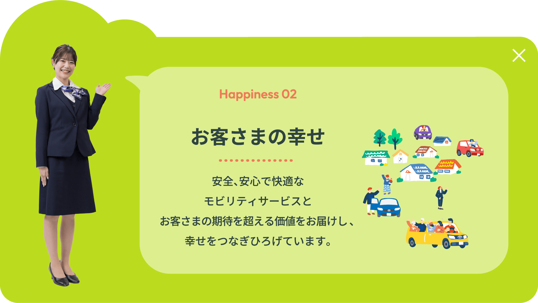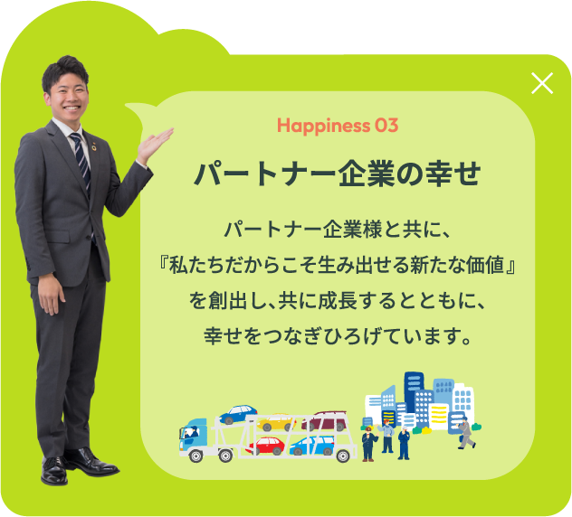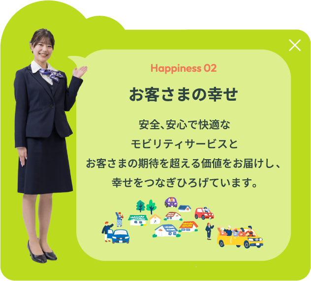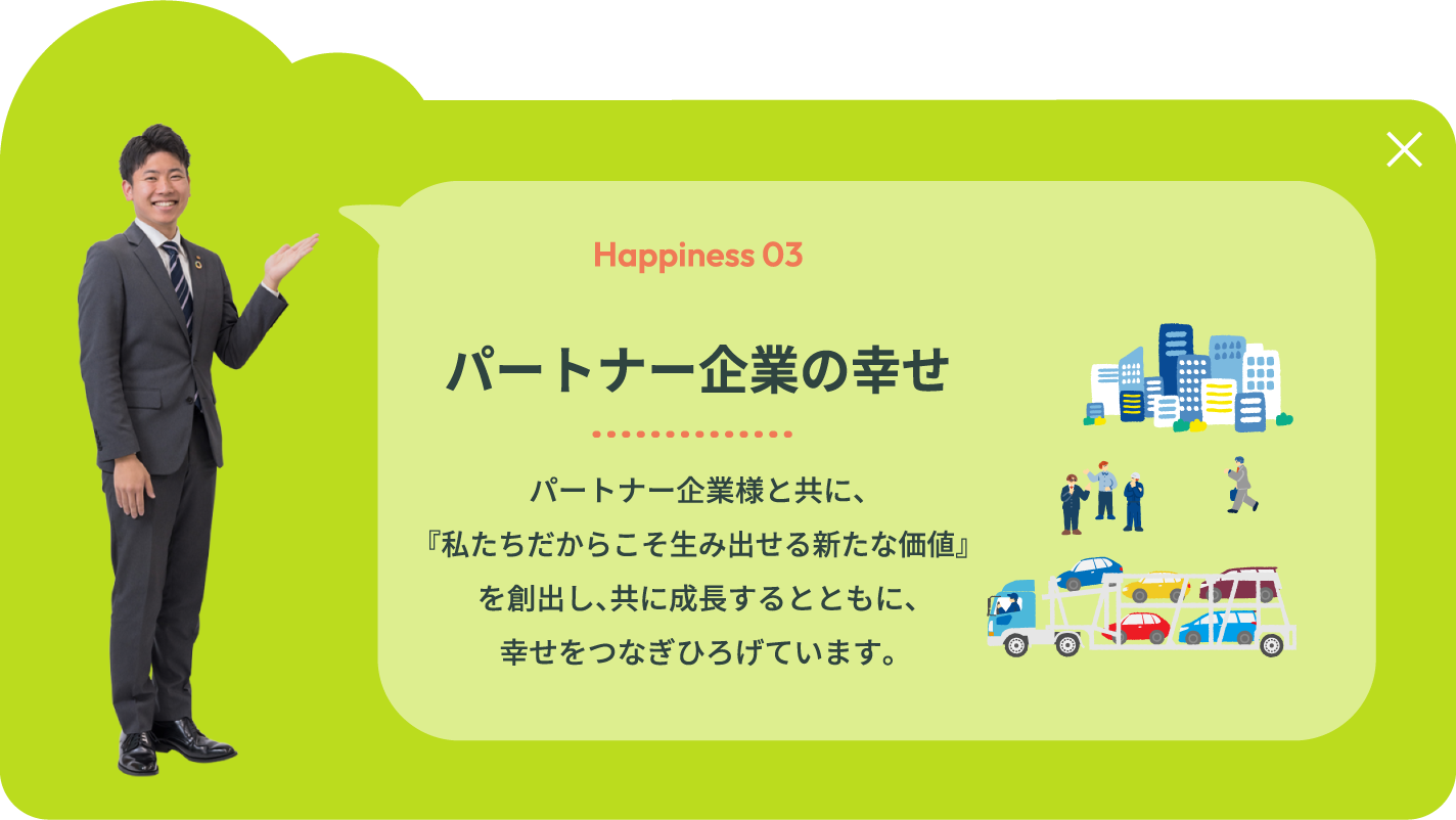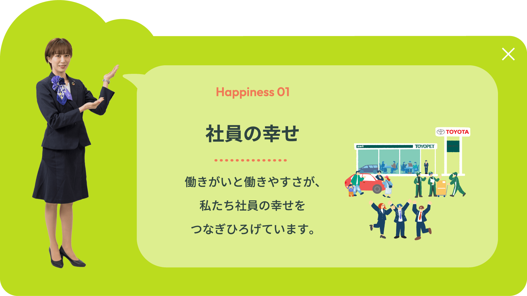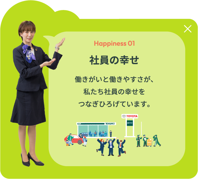 栃木トヨペットが目指すのは、「幸せを量産する“町いちばんのクルマ屋”」。 その実現のために大切にしているのは、働く社員一人ひとりが、 自らの仕事に自信と誇りを持ち、明るく、元気に、そしてイキイキと活動できること。 私たちが企業として大切にしている考え方やその根底にある経営理念など、 栃木トヨペットの想いについてご紹介します。